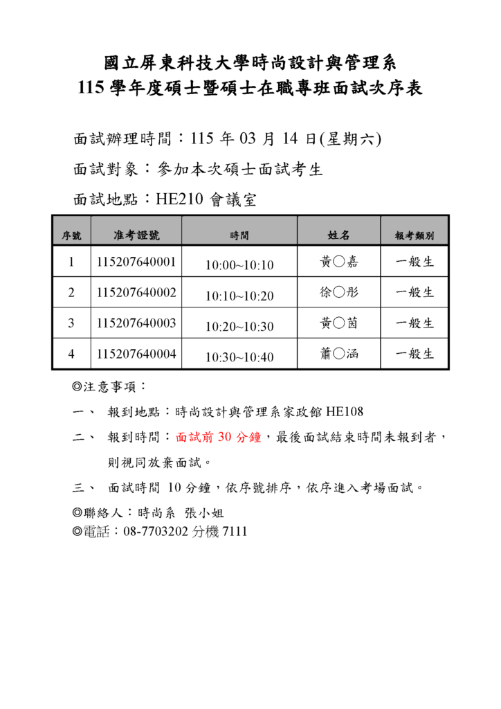 Post author:編輯 Post published:2026-03-11 Post category:招生資訊 / 最新消息 / 系所公告 115學年度碩士暨碩士在職專班面試次序表 注意事項: 考生須攜帶雙證件及准考證 (證件如身分證、健保卡或駕照等,以備查證) 報到時間:面試前30分鐘,最後口試時間結束尚未報到者,則視同放棄口試。 相關連結:https://adas.npust.edu.tw/2026/03/115%e5%ad%b8%e5%b9%b4%e5%ba%a6%e7%a2%a9%e5%a3%ab%e7%8f%ad%e6%9a%a8%e7%a2%a9%e5%a3%ab%e5%9c%a8%e8%81%b7%e5%b0%88%e7%8f%ad%e5%90%84%e7%b3%bb%e6%89%80%e9%9d%a2%e8%a9%a6%e8%b3%87%e8%a8%8a/ You Might Also Like 台灣血液基金會「114年校園捐血宣導海報設計比賽」鼓勵學生踴躍參與 2025-09-10 114高中職師生暑期營-時尚藝術創作研習 2025-07-23 5/11邀請荷蘭籍設計師 GERARD JASPERSE 亞河瑞 老師主導舉辦全英 Design &Culture Workshop 2022-05-12
